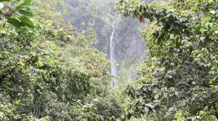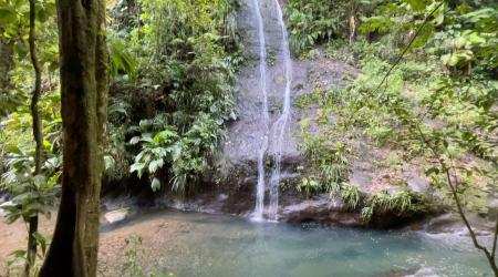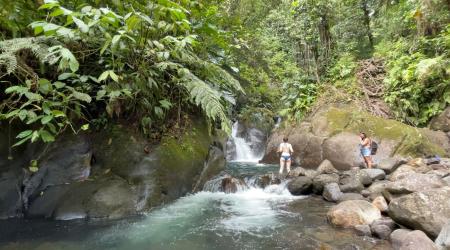 Là, dans une trouée de la forêt tropicale, au pied des rochers, un bassin s’est creusé au fil du temps dans des blocs volcaniques. Mais avant de pouvoir vous tremper les orteils, vous devez descendre dans le lit de la rivière en vous aidant de racines ou de lianes.