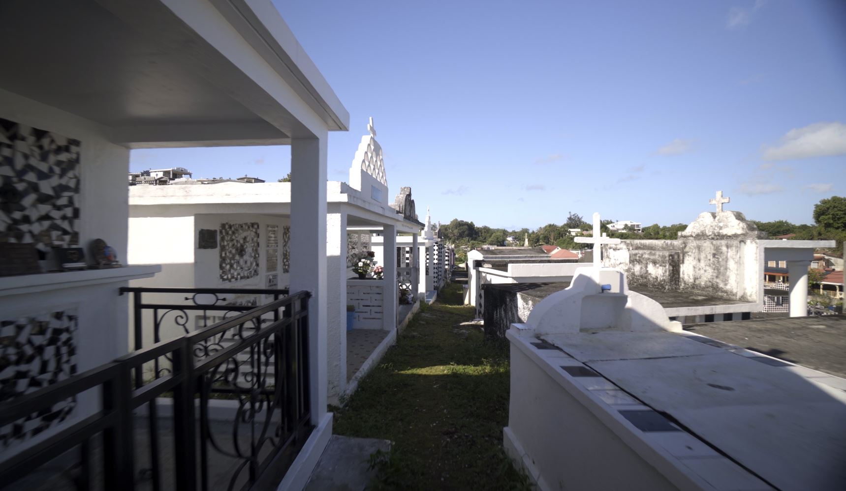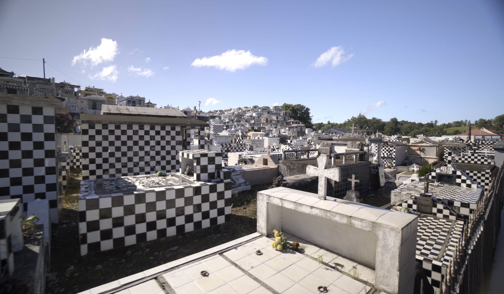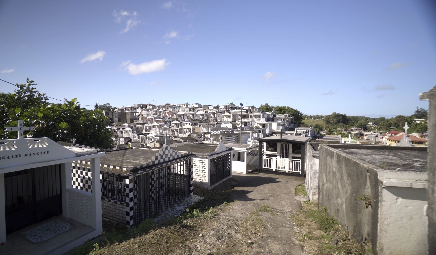 Dès votre arrivée, avant même de passer le portail qui indique l’entrée du cimetière, un flanc de colline vous fait face, entièrement recouvert de monuments funéraires. Cet amphithéâtre naturel pourrait même, au premier regard, être facilement confondu avec un village miniature, et pour cause ! Certains caveaux ont des toits en pente rappelant les cases créoles. D’autres ont même été conçus par des architectes à la demande de familles aisées.