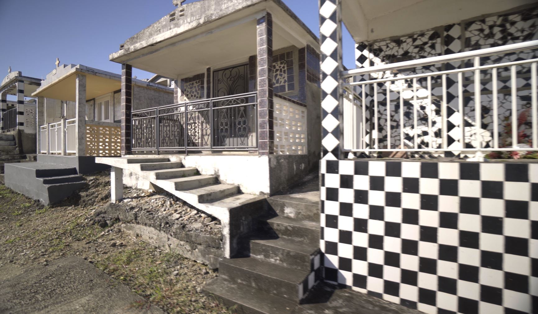 Un autre détail vous a également sauté aux yeux ! Bien que le blanc domine largement, vous avez l’impression d’observer un échiquier grandeur nature. Si quelques sépultures sont légèrement colorées de teintes pastel, la majorité d’entre elles sont ornées de tuiles au motif de damiers noirs et blancs, ce qui fait de ce cimetière un site unique en son genre. Le choix du motif qui prédomine reste un mystère. Beaucoup y voient une couleur symbolique liée au deuil (noir pour les Occidentaux et blanc pour les Africains), mais pour certains, les carreaux noirs et blancs, qui recouvrent les monuments en ciment, ressemblent étrangement à la faïence des cuisines ou salle-de-bains…