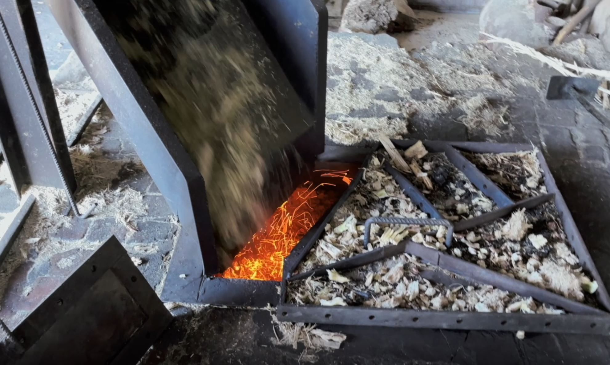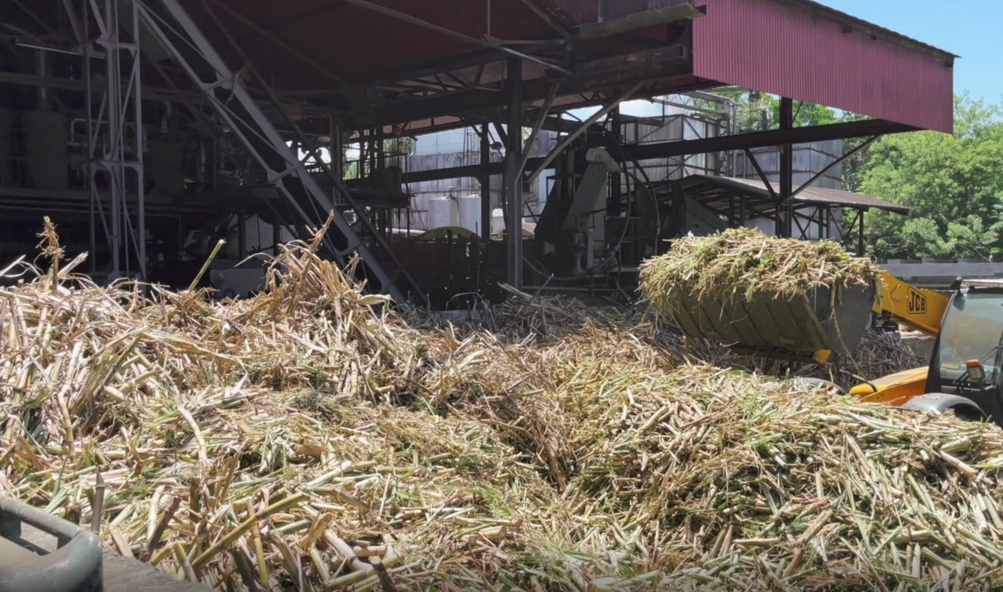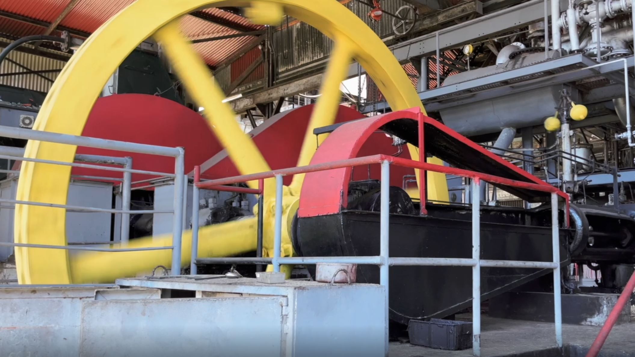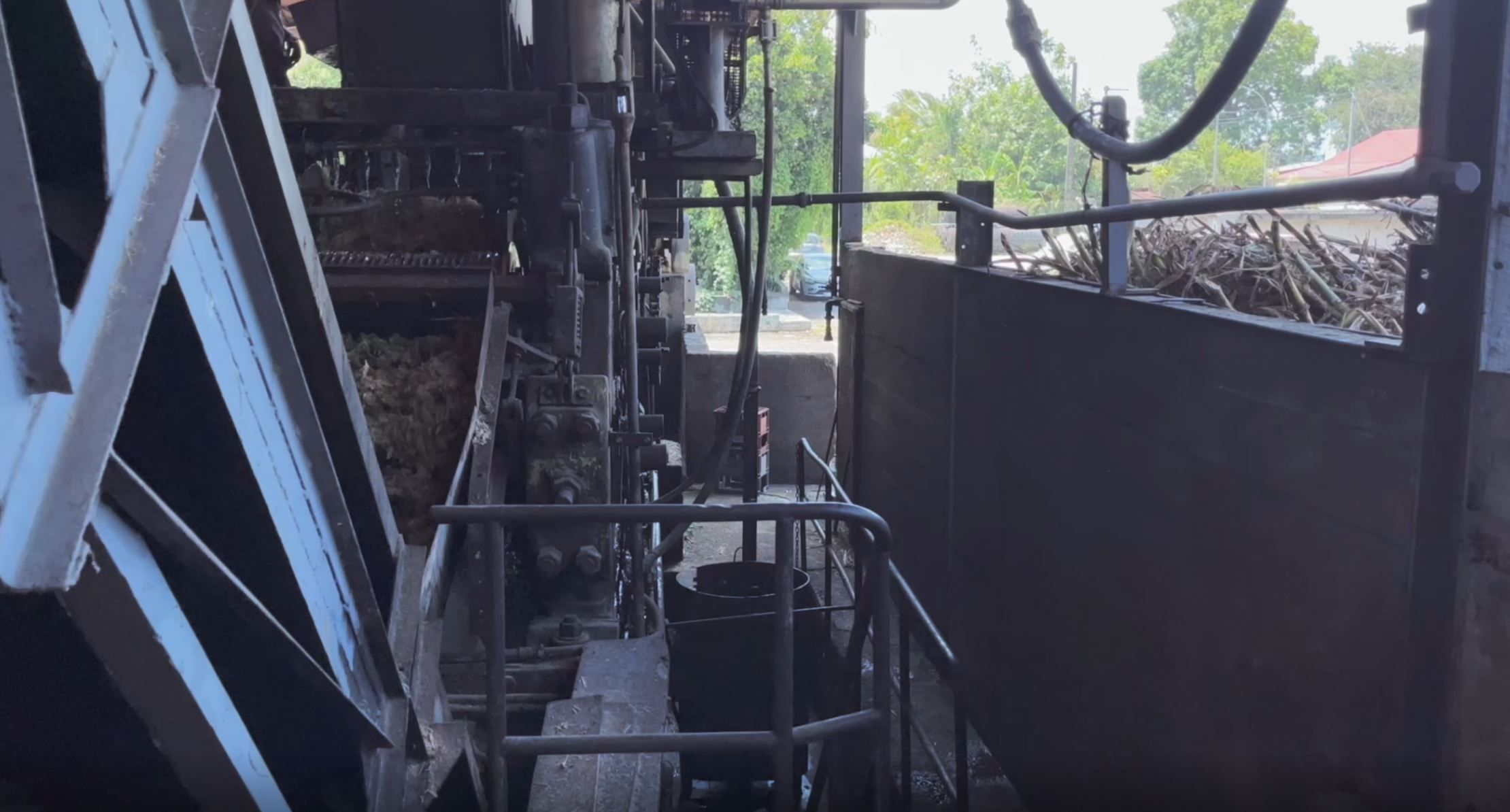 La bagasse, c’est-à-dire la partie solide et sèche de la canne à sucre, sert d’énergie première. Elle alimente un four qui chauffe de grands bacs d’eau, produisant ainsi de la vapeur. Celle-ci est mise sous pression et dirigée à l’aide de tuyaux vers un piston qui actionne la grande roue de l’atelier de broyage, qui fonctionne ainsi depuis 153 ans !