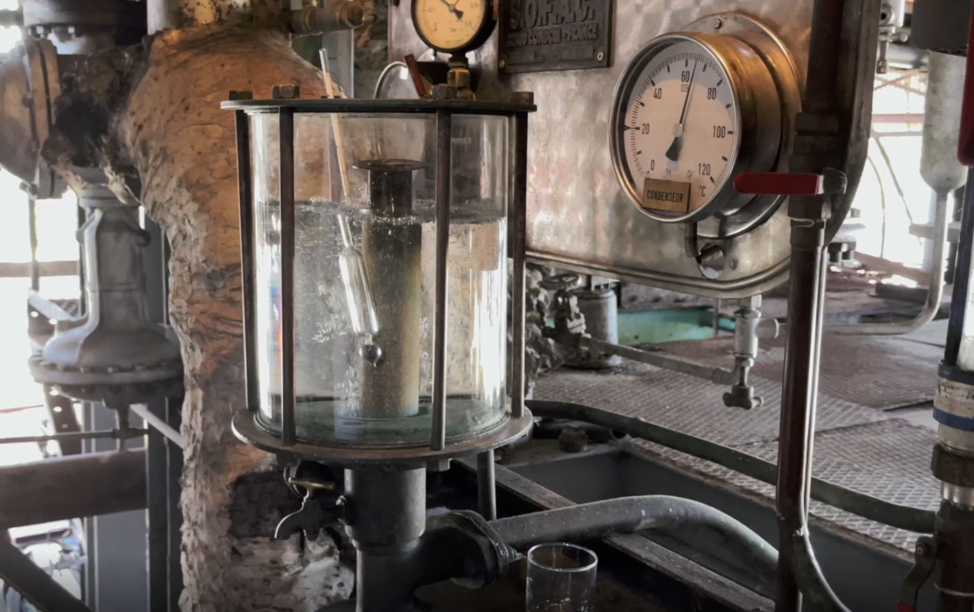 Vient enfin la phase cruciale, celle de la distillation. Effectuée dans la plus pure tradition, tout est fait à l’ancienne, loin de tout appareil électronique. Seuls quelques vannes et appareils de mesure traditionnels permettent d’élaborer le futur breuvage, qui à sa sortie possède un taux d’alcool à environ 75° - 80°, voire un peu plus. Si après une première distillation, le liquide nécessite quelques ajustements, il est alors distillé dans une seconde colonne dite de correction.